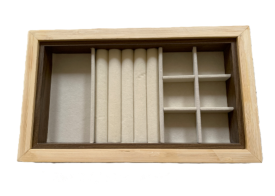 As most boxes are made to order they can be cusomised in a number of ways: Text on spine can be changed Colour of hinge straps can be changed The inside of the cover can be engraved On medium size ring insert can be swapped for multi compartment insert